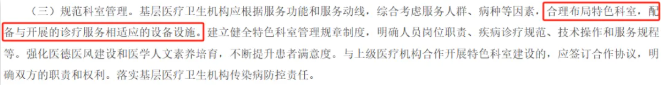 该政策要求基层医疗卫生机构立足常见病、多发病和诊断明确的慢性病等,优先发展儿科、妇科、康复医学科、精神(心理)科、五官(口腔)科等重点科室,鼓励基层医疗卫生机构提升高血压、糖尿病、慢阻肺、疼痛、等专病专科服务能力和老年人群多病共防共治能力。