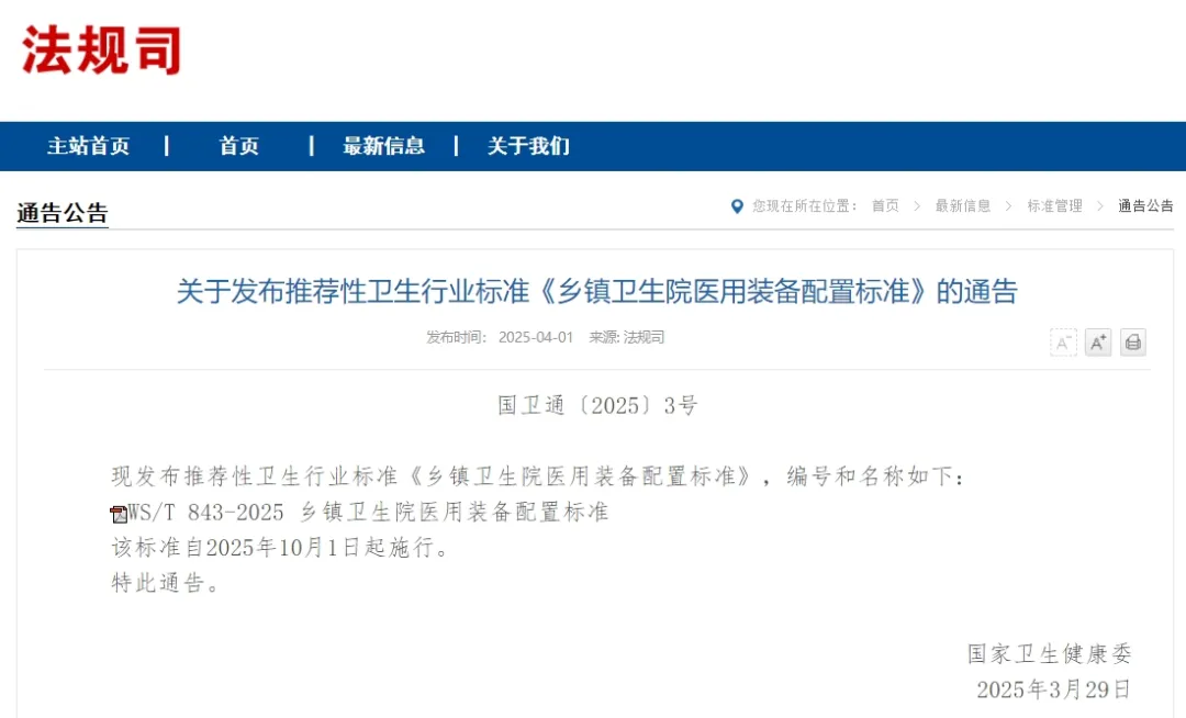 而 10 月 1 日正式施行的《乡镇卫生院医用装备配置标准》,则结合基层发展现状,将医用装备分为通用、专用两类,明确要求乡镇卫生院配置监护设备、心电图机、动态心电设备、AED(自动体外除颤器)、血压计、血氧仪、盆底康复、冲击波等设备,为基层设备升级划定了明确标准。