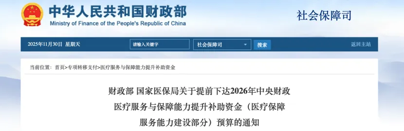 近日,财政部发布《财政部国家医保局关于提前下达2026年中央财政医疗服务与保障能力提升补助资金(医疗保障服务能力建设部分)预算的通知》《财政部国家医保局关于提前下达2026年中央财政医疗救助补助资金(城乡医疗救助部分)预算的通知》《财政部国家医保局关于提前下达2026年中央财政城乡居民基本医疗保险补助》,明确传递出国家持续加大医疗卫生投入、着力“强基层”的坚定信号。