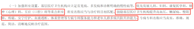 该政策要求基层医疗卫生机构立足常见病、多发病和诊断明确的慢性病等,优先发展儿科、妇科、康复医学科、精神(心理)科、五官(口腔)科等重点科室,鼓励基层医疗卫生机构提升高血压、糖尿病、慢阻肺、疼痛、等专病专科服务能力和老年人群多病共防共治能力。