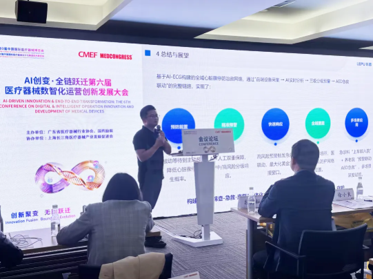 值得一提的是,乐普代表受邀亮相 CMEF 展会分会场,围绕全域心脏骤停防治救解决方案开展专题现场分享,凭借前沿的技术设计、完整的链路布局与落地的场景赋能,成为分会场焦点议题。该方案以乐普 AI-ECG 核心技术为底座,构建起全域心脏骤停防治救网络,打造 “前端设备采集→AI 实时分析→三级分级预警→AED 急救联动” 的完整诊疗救治链路,实现心脏骤停从被动等待到主动预防的模式升级,大幅提升心脏骤停患者生存概率。